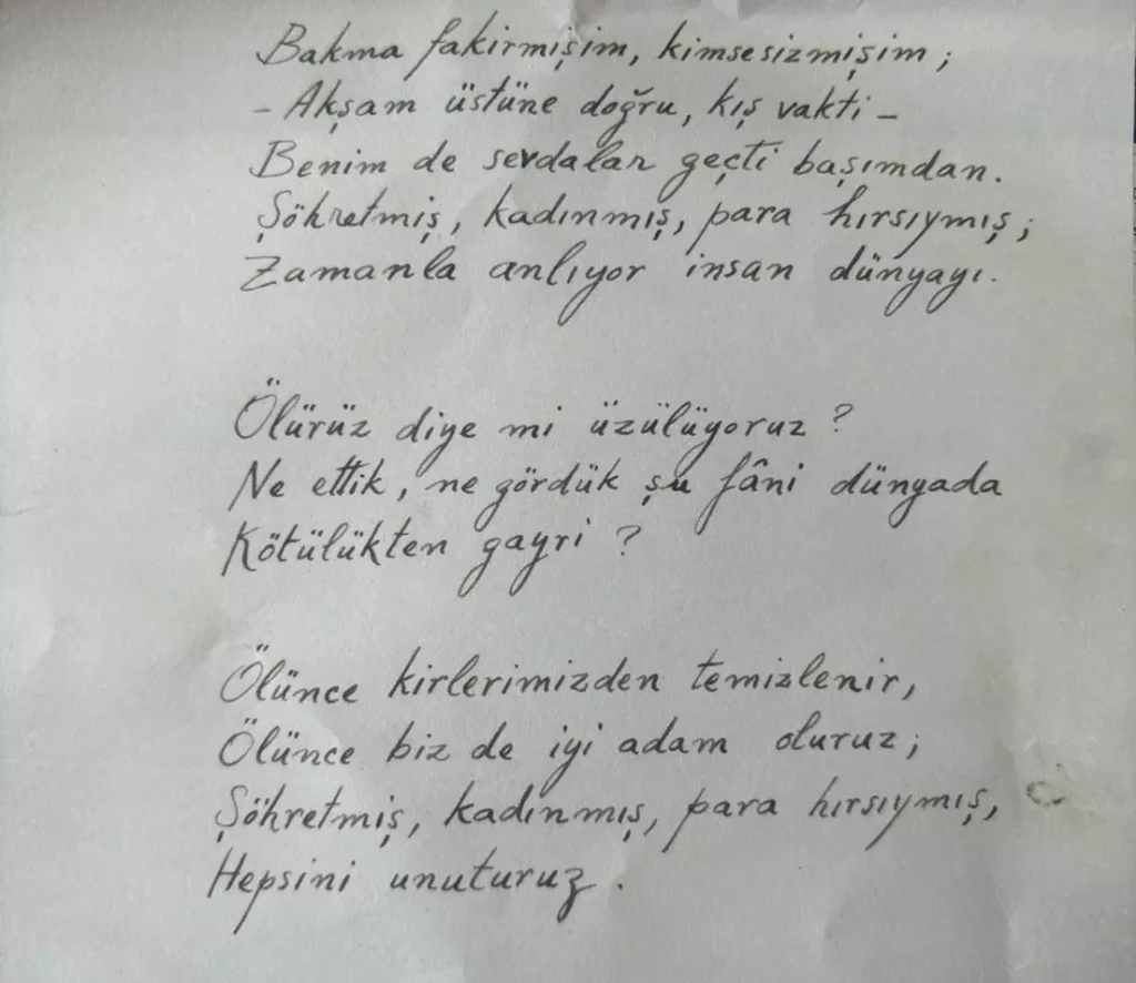Gazete bayisinin önünden geçerken bir dergi kapağında “Orhan Veli 110 yaşında” cümlesini okudum. Orhan Veli ile ilgili özel bir çalışma yaptıklarını düşünerek dergiyi satın aldım. Kapak görseli ve hediye ettikleri cep defteri dışında Orhan Veli’ye dair bir şey yoktu. Derginin arasından bir de Orhan Veli’nin el yazısıyla yazdığı Ölüme Yakın adlı şiirin kopyası çıktı. Bu, bir içerikten daha fazlası.